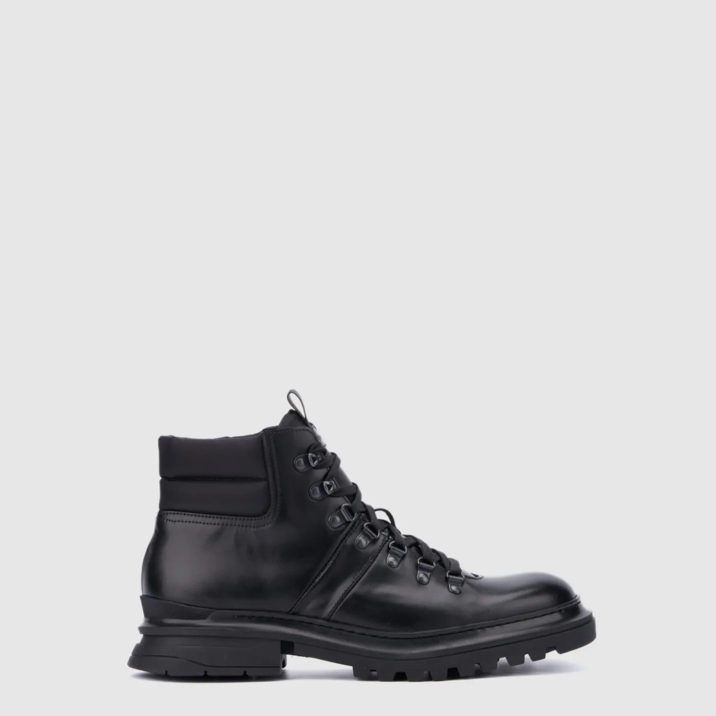 Designed in waxed suede/nappa (grey or cognac) or calf leather/nylon (black), the Edwin boot conveys a sturdy sensibility. With D-ring hardware and a lace-up closure, it features a nylon loop and padded back counter. The logo detail adds a subtle accent.